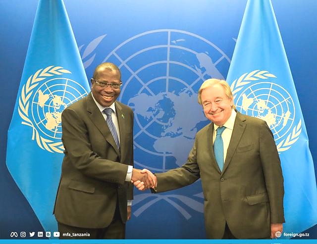 Mhe. Balozi Hussein Athuman Kattanga, Mwakilishi wa Kudumu wa Jamhuri ya Muungano wa Tanzania Umoja wa Mataifa (kulia) akiwasilisha Hati za Utambulisho kwa Mhe. António Guterres, Katibu Mkuu wa Umoja wa…