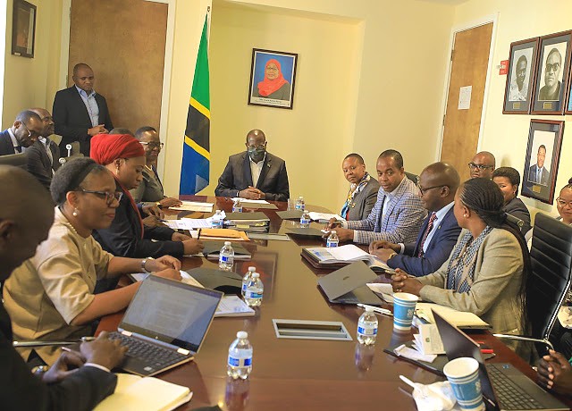 Makamu wa Rais wa Jamhuri ya Muungano wa Tanzania Mhe. Dkt. Philip Isidor Mpango akizungumza na ujumbe wa Tanzania unaoshiriki Mkutano wa 77 wa Baraza Kuu la Umoja wa Mataifa (UNGA77) alipowasili katika Ofisi za Ubalozi jijini New York kwa ajili ya maandalizi ya Mkutano huo