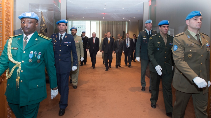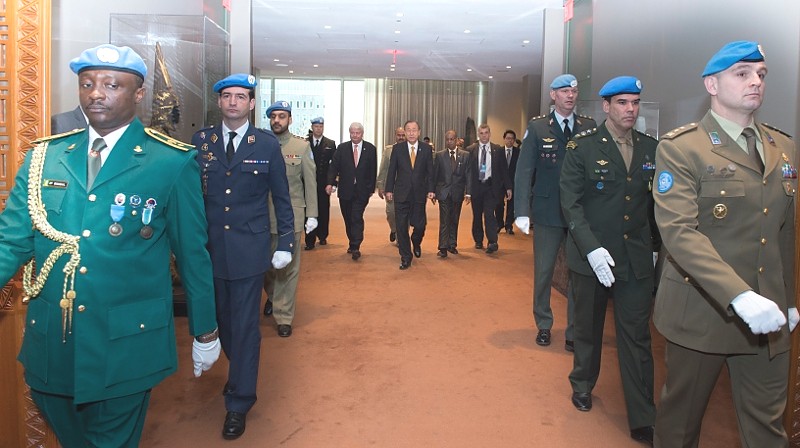 Katibu Mkuu wa Umoja wa Mataifa, Ban Ki Moon, akiingia kwa staii ya aina yake wakati alipokwenda kufungua mkutano wa kwanza wa aina yake kufanyika katika Umoja wa Mataifa, ambapo Wakuu wa Majeshi ya ulinzi kutoka nchi zaidi ya 100 walikutana kwa wakati mmoja na mahali pamoja kujadiliana na kubadilishana mawazo kuhusu operesheni za ulinzi wa amani za umoja wa mataifa.