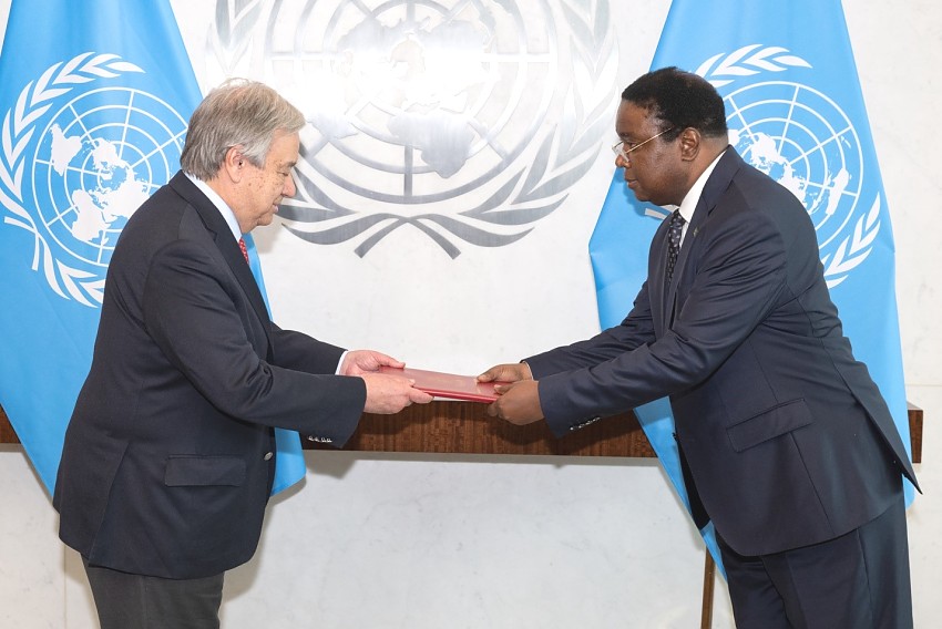 Mhe. Balozi Hussein Athuman Kattanga, Mwakilishi wa Kudumu wa Jamhuri ya Muungano wa Tanzania Umoja wa Mataifa (kulia) akiwasilisha Hati za Utambulisho kwa Mhe. António Guterres, Katibu Mkuu wa Umoja wa Mataifa (kushoto) katika hafla iliyofanyika tarehe 17 Aprili, 2023 Makao Makuu ya Umoja wa Mataifa New York, Marekani